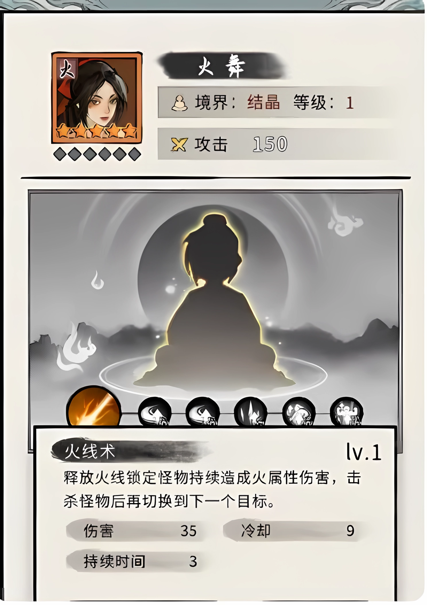 火舞是火系输出类型的弟子,技能为火线术,能释放多条火线锁定怪物并持续造成火属性伤害,当前怪物被击杀后会自动切换到下一个目标。