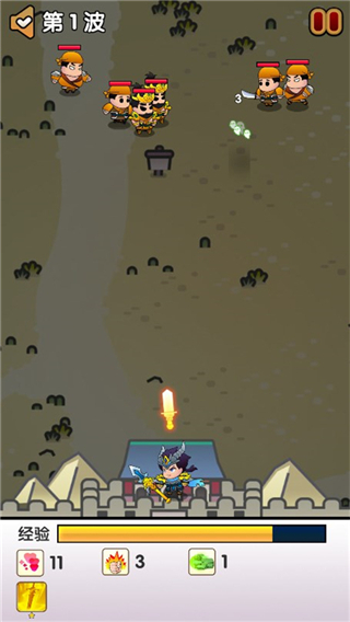 1、进入游戏后,角色会自动攻击,不能让敌军碰到城墙,否则会游戏结束。