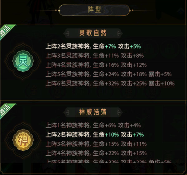 上阵不同数量的相同阵营神将会为战斗中的全体神将带来不同程度的属性加成,合理选择上阵神将,尽可能激活最大属性的阵营增益,将极大提高自身的胜率。具体阵营增益搭配可在布阵面板中点击阵营图标查看。