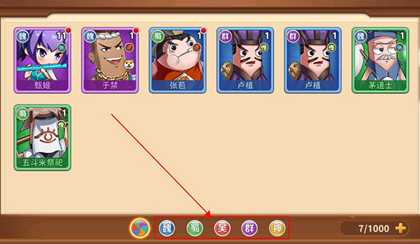 1、游戏内一共有魏蜀吴群神五种武将类型,每种阵营武将都有专属特性。