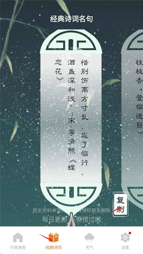 3、经典诗词有着丰富的诗词,接着点击右下角来一键复制使用