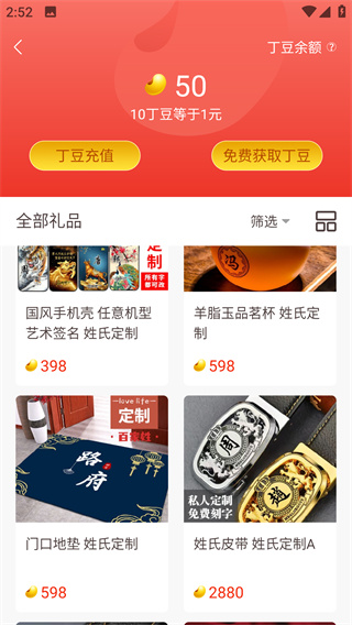 3、应用内也为给位用户精心准备了各种礼品,都是可以免费兑换的,是通过丁豆兑换,丁豆可以做任务免费获得。