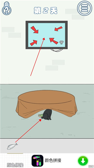 2、第二关,点击画上的鱼,在点击桌布,把鱼给猫。