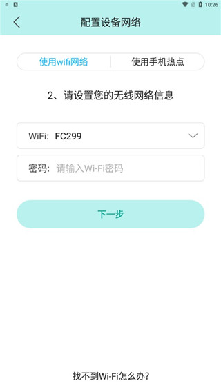 4、配置设备网络,可以使用WiFi或者手机热点,然后输入密码,点击下一步;