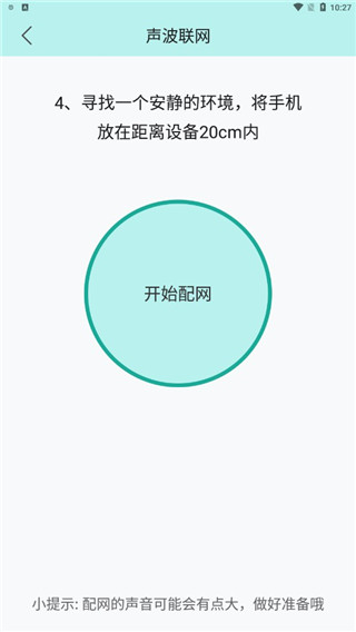 6、寻找一个安静的环境,将手机放在距离设备20cm内,然后点击开始配网;