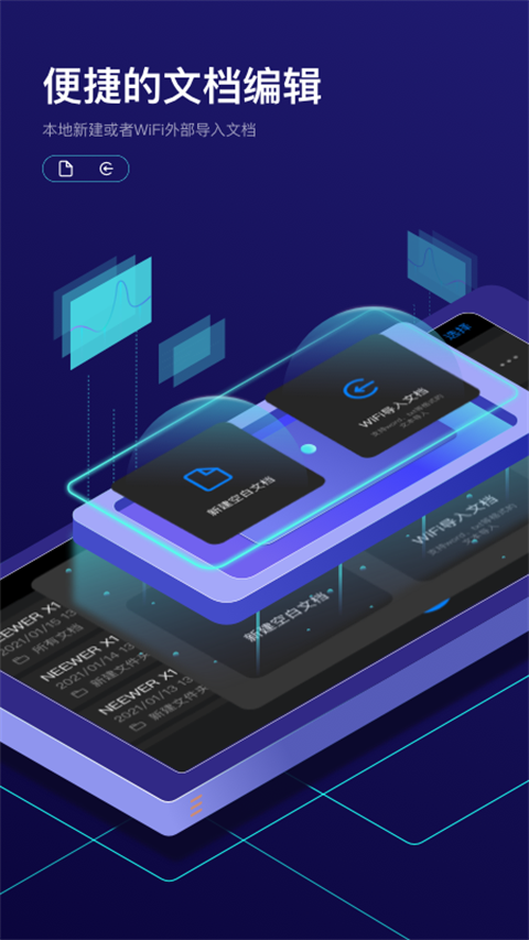 4、便捷的文档编辑功能让你轻松新建文档,通过wifi外部导入文档,让文档编辑更加轻松。