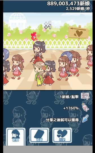 1、既然前面已经说了这是一款放置类手游,肯定是需要玩家不停地点点点的,如图所示,只要点击屏幕上新娘所在的位置,就会出现“+1”,所以为了拥有更多的新娘,快点疯狂点击吧