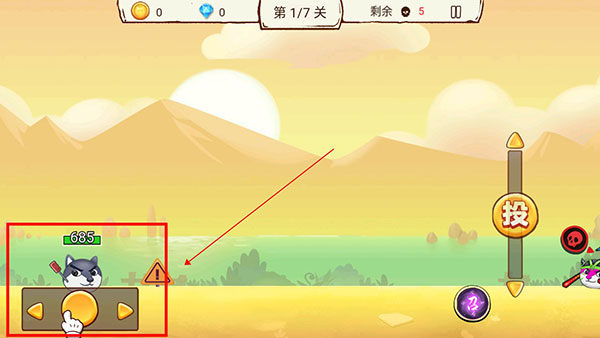 3、通过左方按钮可操控狗头进行移动,通过上下滑动“投”可进行远程射击;