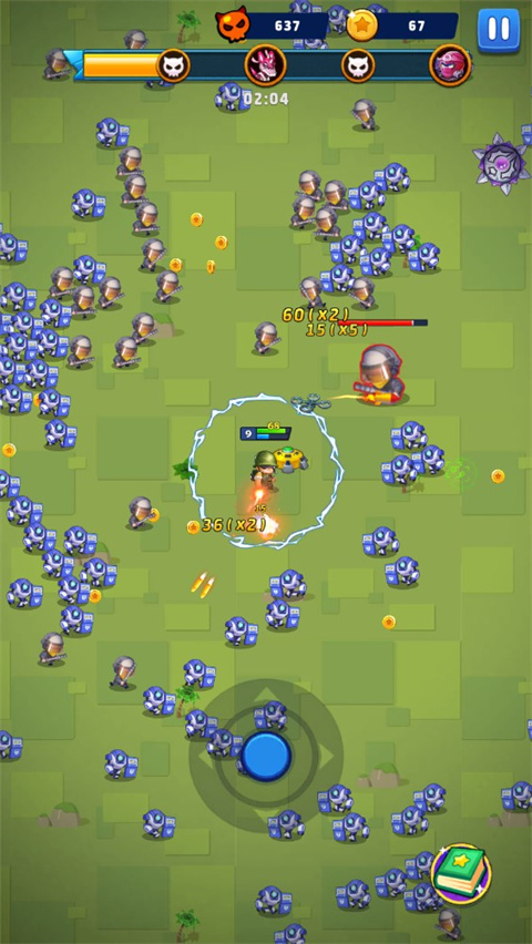 4、通过滑动屏幕来控制角色的移动方向,你需要在这个超大的地图中消灭大量的敌人,保卫世界;