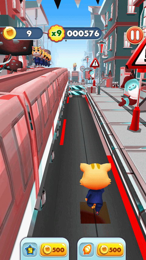 1、游戏主要以躲避和跑酷为主,玩家需要控制猫咪在道路上奔跑,需要注意躲避各种障碍物。