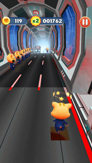 这个游戏是一个魔改版的地铁跑酷,画面变成了暗红色,金币还被改成猫咪的样子,看起来特别有趣。玩法很简单,就是左右滑动控制猫咪躲闪障碍物和追捕者,上下滑动跳跃或者滑行。收集金币可以解锁新的装饰和角色,还能用道具让游戏更有挑战性。