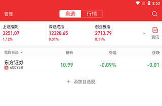 2、切换到【行情】页面,我们可以在这里添加自选股,并且还能看到相关股票的最新价、涨跌幅等情况。
