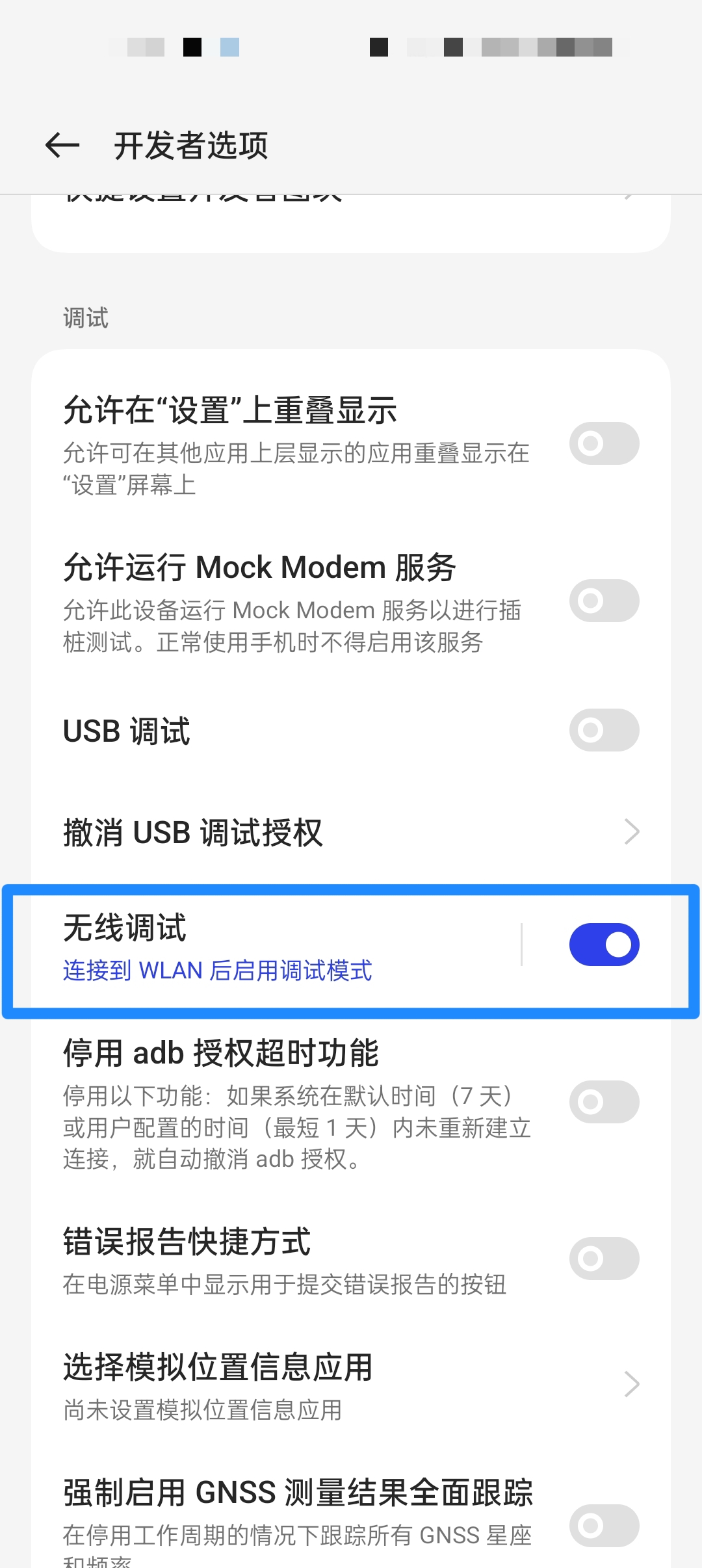 3、在【开发者选项界面】打开无线调试。