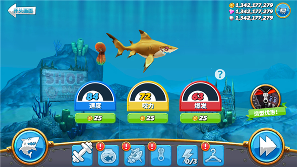 升级你的鲨鱼装上超酷的装备,咬合更用力、游的更迅猛变得更贪婪!每只蓄势待发的鲨鱼都需要、耳机、雨伞还有超炫的喷射背包!