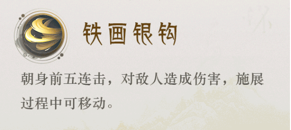 一技能:铁画银钩:朝身前五连击,对敌人造成伤害,施展过程中可移动