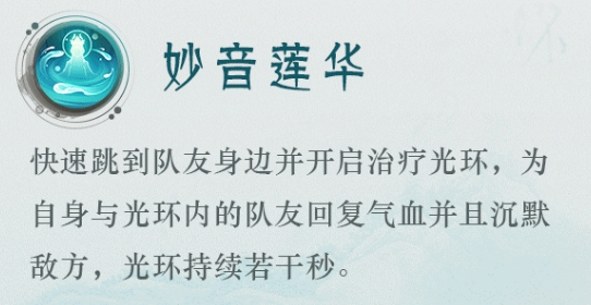 四技能:妙音莲华:快速跳到队友身边并开启治疗光环,为自身与光环内的队友回复气血并且沉默敌方,光环持续若干秒。