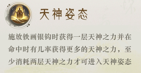 四技能:天神姿态:施放铁画银钩时获得一层天神之力并在命中时有几率获得更多的天神之力,至少消耗两层天神之力才可进入天神姿态
