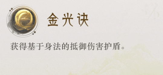 三技能:金光决:获得基于身法的抵御伤害和护盾