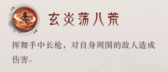 四技能:玄炎荡八荒:挥舞手中长枪,对自身周围的敌人造成伤害