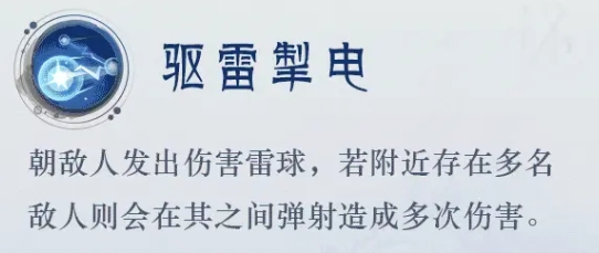 二技能:驱雷掣电:朝敌人发出伤害雷球,若附近存在多名敌人则会在其之间弹射造成多次伤害。