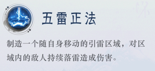 三技能:五雷正法:制造一个随自身移动的引雷区域,对区域内的敌人持续落雷造成伤害。