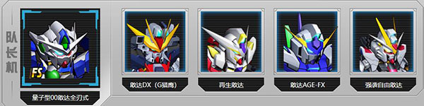 队长机量子型00敢达全刃式+敢达DX(G猎鹰)+再生敢达+敢达AGE-FX+强袭自由敢达:适合新手培养,输出主要靠高星强袭自由,其余机体均具备减能、沉默、瘫痪效果,能够快速争取战场主动,外加多重增益技能效果,3星就可发挥作用。