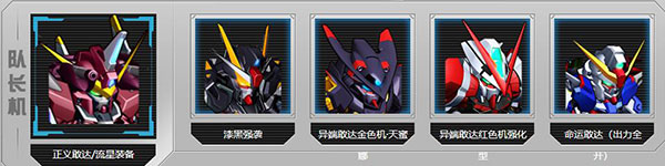 队长机正义敢达/流星装备+漆黑强袭+异端敢达金色机·天蜜娜+异端敢达红色机强化型+命运敢达(出力全开):正义流星增加全队的攻频,前排的穿透与抗性,同时配合全SEED 前排与高闪避的漆黑强袭,高攻频,多样的控制效果。