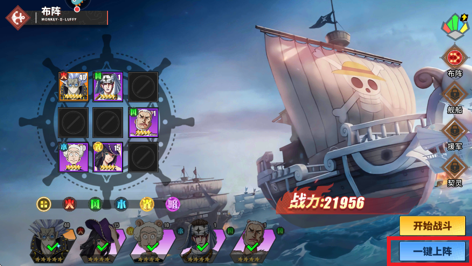 1、选择合适的角色进行布阵上场,也可以点击一键上阵快速布阵。