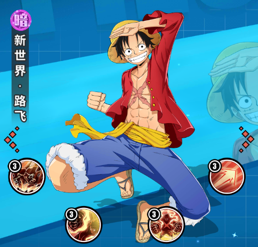 4、被动技能3:修行,在雷利的教导下修行后,新世界路飞在进行攻击时有有75%概率将敌方受击目标身上随机1个增益BUFF转化为诅咒,该单位每存在1层诅咒,自身攻击带来的伤害提升5%,最多不超过25%