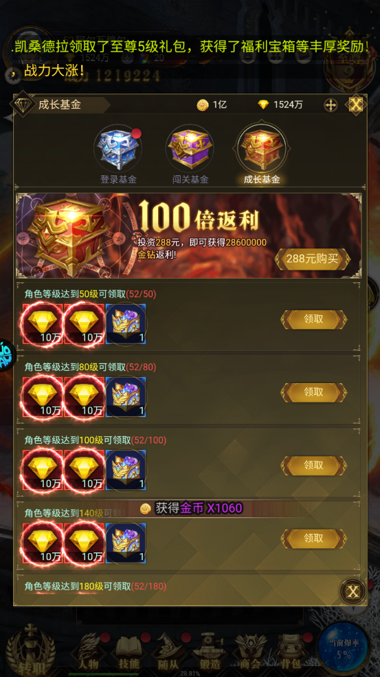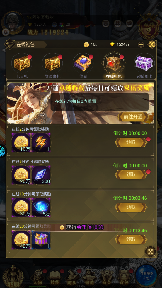 每日登录即可领取豪华奖励,获得金钻和魔王虎符。