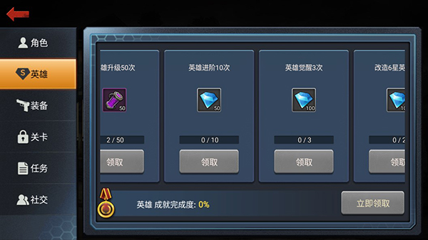 2、英雄:有十四个成就可以达成,一半为英雄升级、进阶、觉醒、升星等,达成后有红装、大量钻石金币等成就礼包可以领取。
