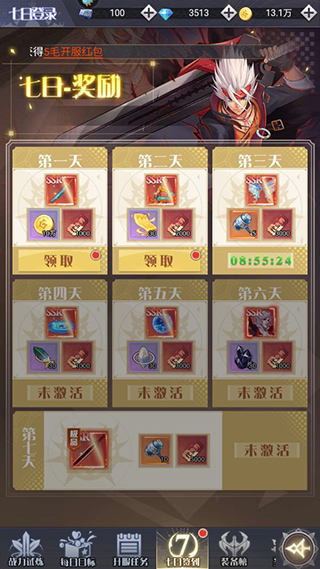 玩家点击左边时装图标,即可进行七日奖励的领取,每一日的奖励的有SSR装备或时装可以领取。