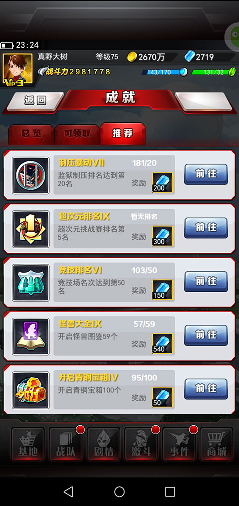 2、除了装备以外,变身器、宝具、人间体、晶源、奥特曼之塔、修炼、星空等都是用来提升战斗力的,最主要废金币,所以不要升级太快,否则你会跟不上节奏的,而且还会乱套、不知所措,得一步步地来,主要的就是说平常就是肝,积累得越多,后期越不怕。