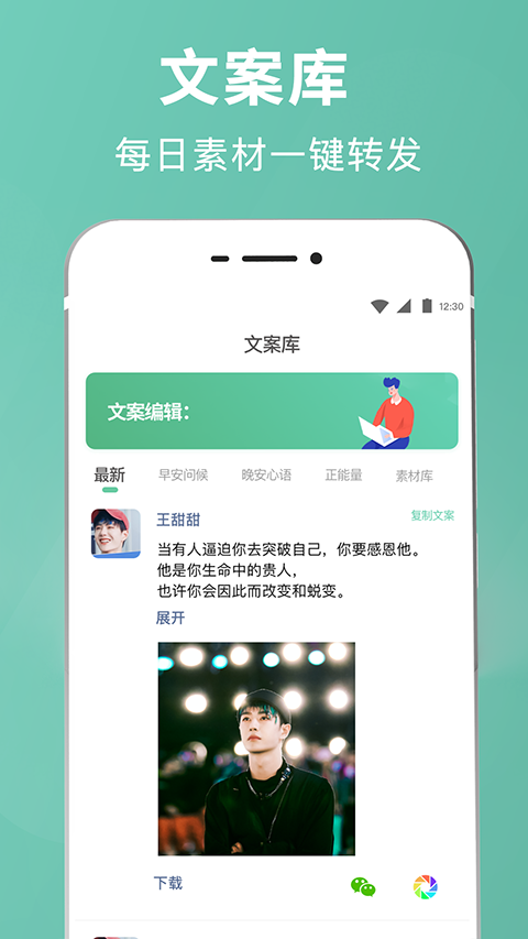 还在为朋友圈中的那些优质文案而拍手称赞吗?还在因为朋友们发的图片非常显眼而羡慕吗?朋友圈文案输入法app来了,它为大家带来了不会被折叠的文案编辑器。在这款软件上,用户们可以利用文案工具对文案进行各种各样的设计,可以参考别人的作品来让自己的作品得到升华。