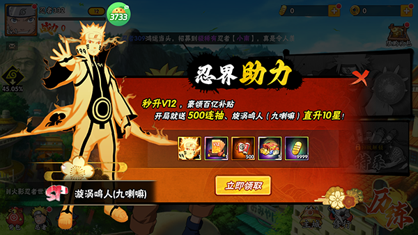 3、丰富的创角福利:玩家在创建角色后,可以享受到开局直升VIP12的豪华福利,以及500次的抽奖机会。此外,还有SP仙系忍者-漩涡鸣人(九喇嘛)作为助力,帮助玩家更好地闯关。