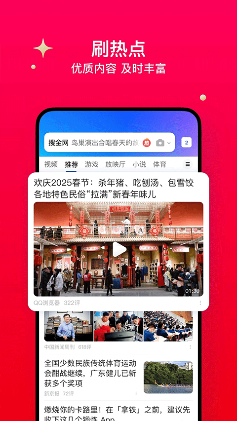 QQ浏览器2025最新版是由腾讯推出的一款手机浏览器,在国内市场占据重要地位。该浏览器专注于提供核心浏览体验,采用先进的IE内核和Chrome 31高速渲染引擎,网页加载速度快,为用户带来极致的 browsing experience.软件亮点包括:- 更安全的网址导航:经过可靠性验证,有效屏蔽有害网站,保障上网安全和个人隐私。- 更便捷的手机上网:创新设计和技术优势使其比传统浏览器操作更流畅、效果更佳。- 强大的增强功能:支持高速下载、换肤、全屏浏览、自定义快捷键等功能。界面简介:1. 首页:每天更新生活资讯和正能量视频等内容。2. 免费小说:提供热门书籍分类展示,并支持免费阅读和下载,用户可边读边评论,查看明星笔记,还有限免书籍领取功能。3. 烟火:无聊时可观看实用视频解说。4. 文件管理:自动保存微信、QQ文档,防止丢失。5. 我的:支持夜间模式、无痕浏览、王卡免流等功能,并记录流量历史。软件优势:1. 精简设计,界面清爽直观2. 精选站点快速直达3. 无痕模式保护隐私4. 海量新闻资讯覆盖广5. 视频资源丰富多样6. 强大的文件助手功能7. 实用的翻译和扫一扫功能更新日志:v15.9.5.5055版本- 升级优化了【书签收藏】界面,提升浏览清晰度- 优化【历史记录】布局,增加按日期快速筛选功能