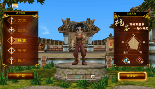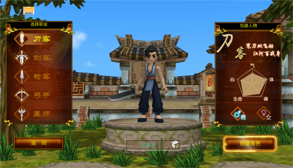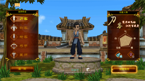 目前版本提供了5大经典职业可供选择,分别是【刀客、剑客、枪客、弓手、医师】,每个职业都各具特色,登录游戏创建角色阶段可以选择心仪的职业哦~