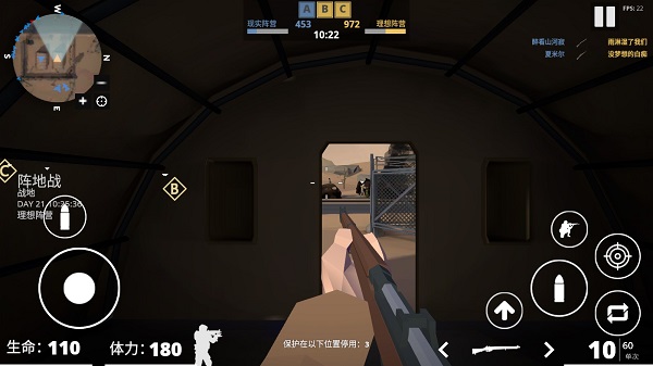 执行完上述操作后,下面便可开始对抗,该游戏已第一人称视角为主,在此玩家可以通过左侧的虚拟摇杆操控人物移动,右侧则对应着下蹲、跳跃、射击以及换弹和瞄准按钮。