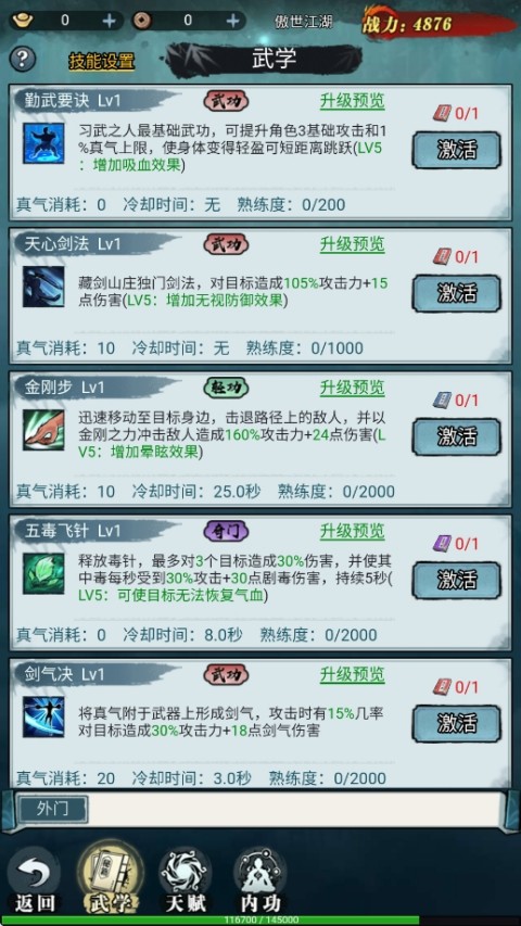 3、新手建议商城购买武学残页,迅速将武学等级提升至5级,性价比极高。进阶玩家建议提升至10级
