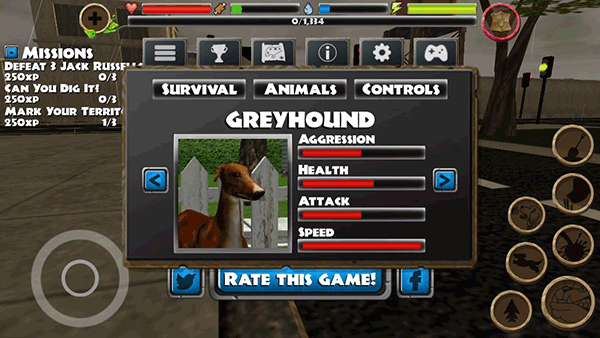 在屏幕的上方有五条状态栏相信大家在玩的过程中也有注意到,那么现在小编就为大家介绍一下作用,最下面的那条最长的是经验值,当经验值满了之后狗狗就会升级,升级之后各项属性都会增加,并且上方四条状态栏全满。上方第一个是健康值,这是保证玩家操控的狗狗由于别的狗狗一战的资本,如果这条状态栏空了,那么游戏就结束了。第二个是饥饿值,玩家们可以通过吃东西来让这一条状态栏满,第三个是渴度,玩家们可以通过喝水来让这一条状态栏满,在这里有一点要说明一下,如果这两条其中一条空了,那么狗狗的健康值就会持续下降,如果健康值也没了,游戏就结束了,最后一条是耐力值,这一条影响着狗狗跑步能够跑多远,跑得越远消耗的越大,如果没耐力了也不要紧,只需要原地休息一会。耐力值就会恢复上来了。在这里小编教大家一个小技巧,因为这个游戏是即时保存的,所以玩家们的上方状态栏不太好的时候,可以退出游戏。然后再进入,那么状态栏就会变成正常状态了,这一条在找不到补给的时候特别好用,当然,如果四条状态栏都特别好的时候不推荐使用。