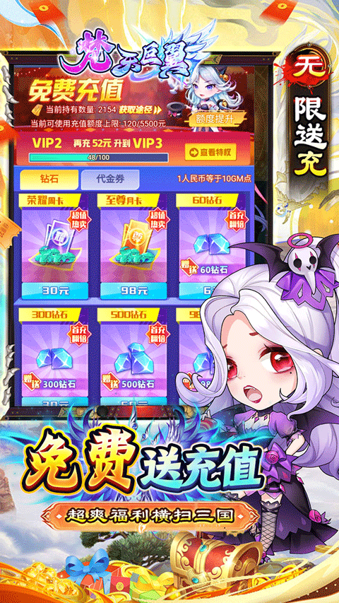 梵天巨翼折扣版是一款致力于创新的三国乱斗放置卡牌手游,该作采用了大量嘻哈搞怪的人物形象和炫酷爆笑的战斗表现效果,q版卡通的游戏画面,趣味十足的游戏玩法,可以带给玩家一种全新的游戏体验。在游戏中玩家可以收集三国中各路武将,它们都将以全新形象呈现,搭配武将前往闯关战斗,前期需要玩家手动点击屏幕攻击,有了武将后即可自动战斗获得宝箱,宝箱可开出武将、钞票、装备等资源,有了资源即可升级我们的角色。另外,梵天巨翼游戏的玩法十分丰富,集多种PVE、PVP玩法和特色养成线,还加入了全自动托管功能,玩家上班下班都可以托管畅玩,打破传统束缚让游戏变得更为轻松,即刻召集群雄开启一统三国新征程吧。