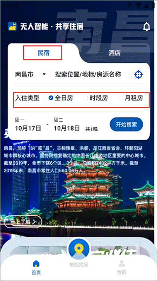 1、下载注册后,打开软件,选择入住类型,这里以名宿全日房为例