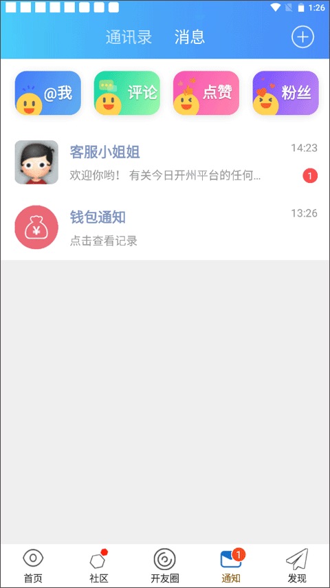 1、进入到软件首页,切换到通知模块,点击右上角的“+”。