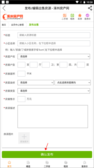 2、输入你的房源标题、小区名称、房屋产权、房屋户型等相关信息,最后点击确认发布即可。