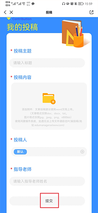 三、点击进入后,将投稿内容编辑完成后点击提交即可完成投稿