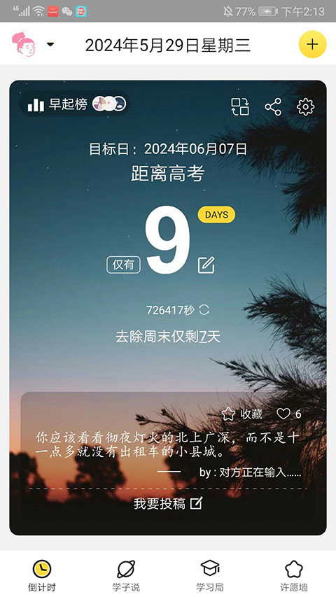 临近高考的时间,许多高三学生已经进入了紧张的复习阶段。然而,面对这场人生大考,不少考生也常常感到焦虑和压力。今天,我们为大家推荐一款专业的高考倒计时软件——由大连拓中教育科技股份有限公司自主研发,专为高考学子打造的学习辅助工具。这款软件凭借其强大的智能系统,为考生们提供了多种实用功能:从个性化的复习计划到实时的学习提醒,再到丰富的学习社区资源,全方位满足备考需求。软件不仅汇聚了全国各地的考生,为大家提供交流平台,更通过独特的"对对碰"功能,帮助考生互相鼓励、分享经验。【软件特色】1. 对对碰:智能匹配学习伙伴,共同为目标努力;2. 学霸锁:专注模式开启,有效提升学习效率;3. 励志金句:每日精选投稿内容,为备考注入动力;4. 早起百人榜:记录学习打卡天数,激励坚持;5. 高考论坛:专属交流社区,分享备考经验;6. 许愿墙:设立目标,冲刺理想大学。【使用教程】1. 下载安装软件后,阅读协议并授予必要权限;2. 进入首页查看倒计时,点击右上角或下方"新倒计时"按钮设置个人目标;3. 在"学子说"和"许愿墙"模块发布动态、分享经验或设立目标;4. 利用"学习局"功能制定并执行复习计划。【软件亮点】1. 学霸锁:帮助克服分心,提升专注力;2. 主题随心换:简约复古卡通风格任选;3. 桌面小助手:提供便捷的学习提醒;4. 轻松分享:支持多平台内容发布;5. 学习论坛:交流备考心得与资源;6. 新增干货:满足多样化的学习需求;7. 高考黄历:每日名言警句鼓励。【更新日志】v4.2.9版本:1. 修复部分闪退问题;2. 提升运行效率。