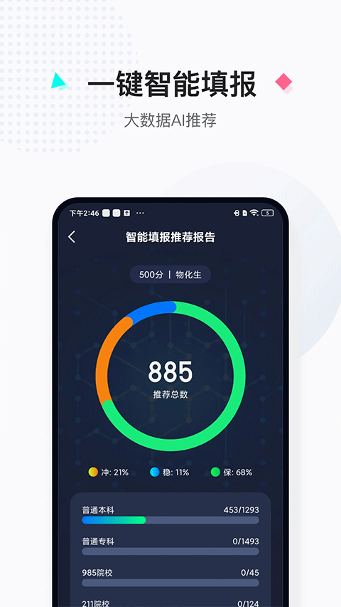 报考大学2025版是由广州宏途教育网络科技有限公司推出的一款高考填志愿类的软件,该软件可以随时为用户推出以考分匹配适合的院校,并且查看学校的历史录取分数,查看院校的专业,全面了解时下热门的专业,选出自己喜欢专业,不让自己后悔。同时还为考生提供大学专业信息、性格测试、学生互动以及高考动态等服务,能够帮助学生及家长选择出自己心仪的大学,不浪费自己高考的每一分。当然报考大学app还包含了大量的数据,并且利用云计算智能为考生进行匹配大学,不仅看分数,还会对您个人兴趣爱好进行匹配,从而帮助家长以及考生选择出最合适、最心仪的大学。