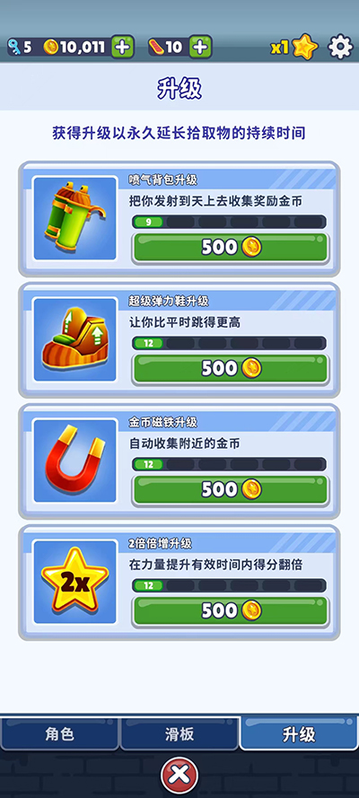 升级:通过金币购买,可以升级道具,使得道具的持续时间更久。升级路线可以按照自己喜好来,不过推荐优先升满喷气背包。