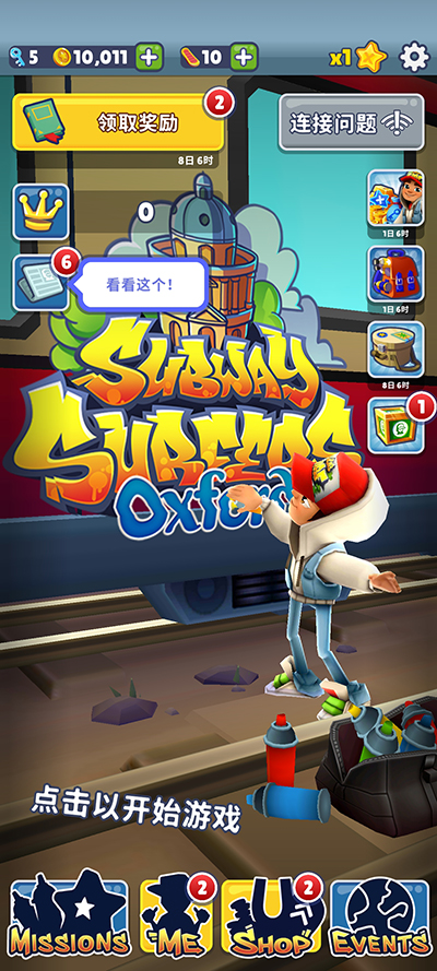 在mission中,还有一个daily challenge,每日挑战,在地铁跑酷游戏中会随机出现字母,获取字母完成单词会获得一个神秘盒子,开出角色徽记(收集后用来解锁角色)或者道具。