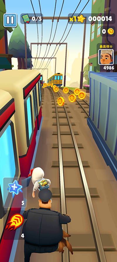 滑板:通过双击屏幕来启动滑板,滑板会持续一段时间。在没有滑板的情况下,角色撞到火车或者障碍等都会被抓住,导致游戏结束。但在有滑板的状态下,角色就有了一道保险,撞到火车等的时候,滑板会消失,游戏可以继续进行。